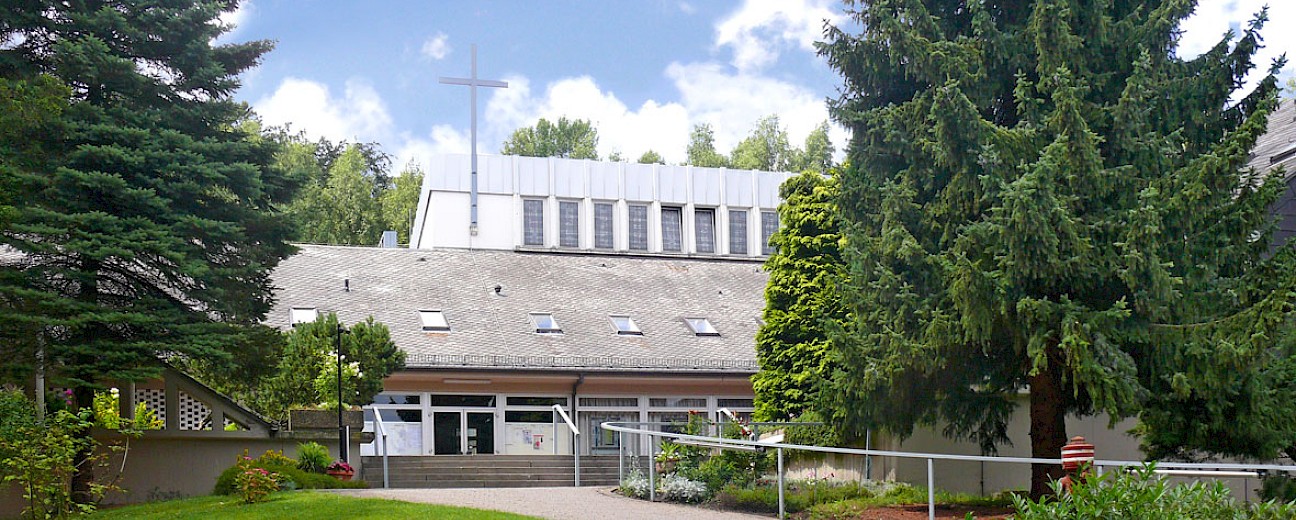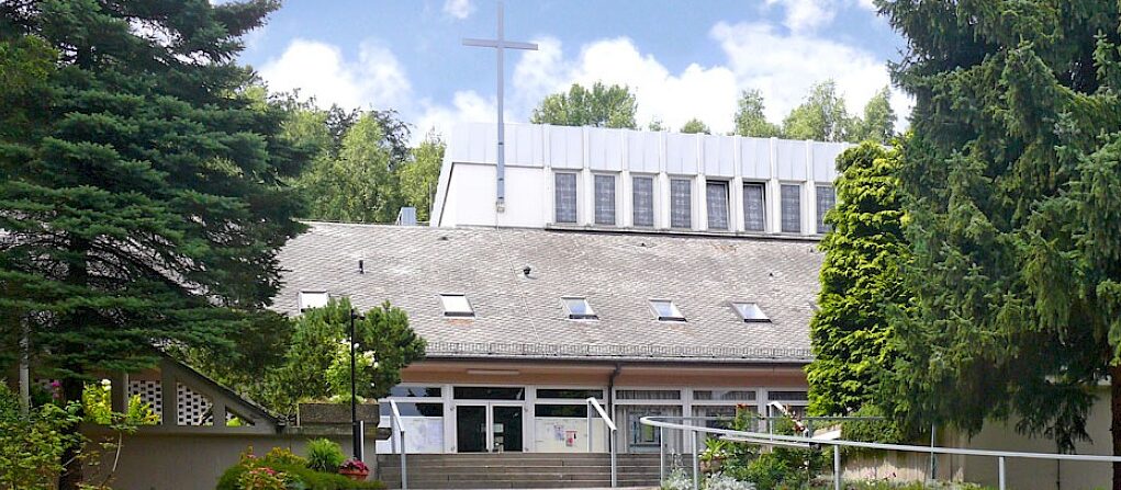 Die Kirche und die Gemeinderäume gruppieren sich um einen offenen Innenhof, der Geborgenheit vermittelt. Im Kirchenraum fällt der Blick auf die Altarwand mit einem Relief zum „Himmlischen Jerusalem“ – einem Bild aus der Bibel für Erneuerung. Das rote Kreuz in der Mitte ist von Symbolen der vier Evangelisten umgeben.