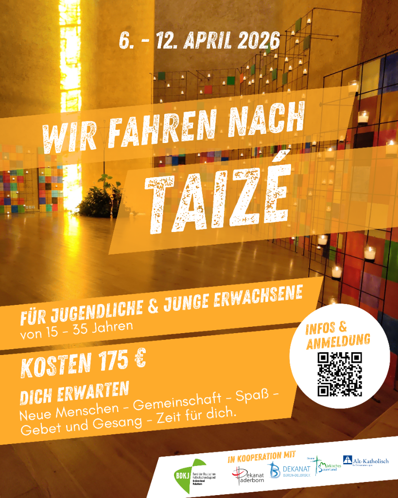 In Kooperation mit dem Dekanat Paderborn, dem Dekanat Büren‑Delbrück, dem Dekanat Märkisches Sauerland und der alt‑katholischen Gemeinde fahren wir in der Osterwoche 2026 (06.–12.04.) nach Taizé. Teilnehmen können alle zwischen 15 und 35 Jahren; wer älter ist und dennoch mitfahren möchte, kann sich gern bei uns melden. Die angegebenen Preise gelten nur für die Zielgruppe.
