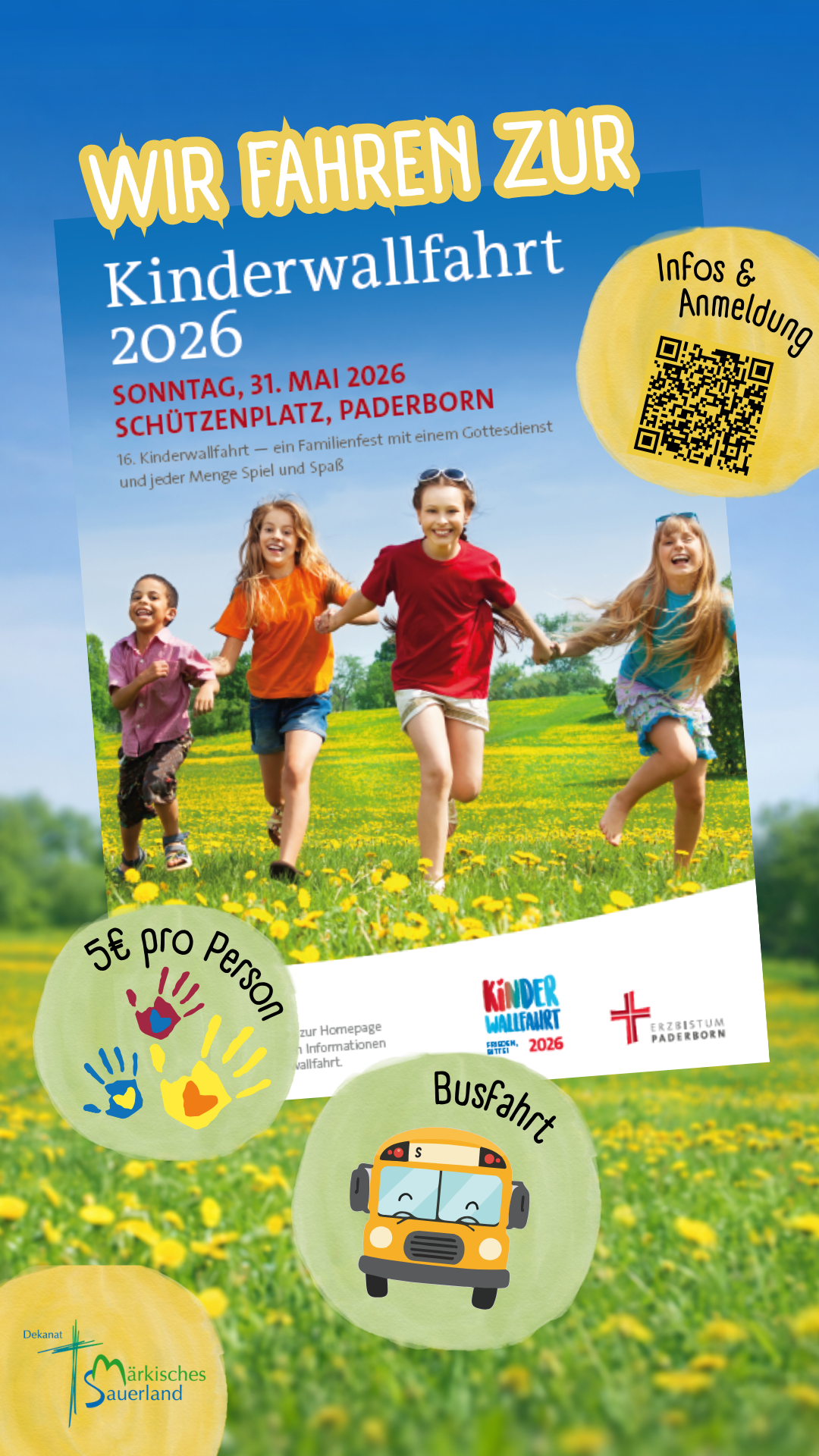 Hier gehts direkt zur Anmeldung: Anmeldung Kinderwallfahrt <https://erzbistumpaderborn.viadesk.com/do/surveyfrontwrite?id=9206822-737572766579> Termin: 31. Mai 2026