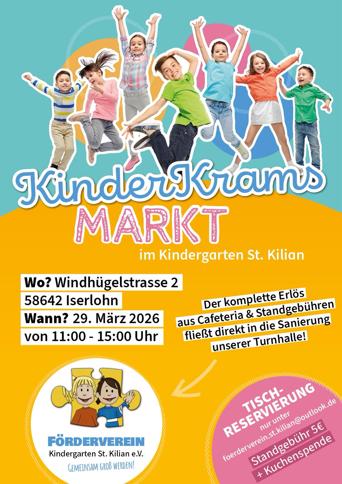 Der Förderverein unserer Kita kath-familienzentrum-st-kilian ist Veranstalter des KinderKramsMARKTes. Eine Tischreservierung ist unter foerderverein.st.kilian@outlook.de möglich. Die Standgebühr beträgt 5,-€ + Kuchspende.