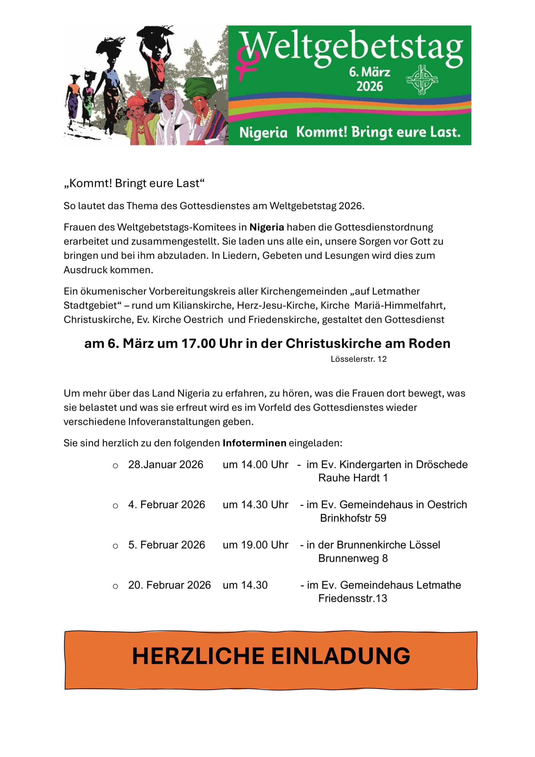 Um mehr über das Land Nigeria zu erfahren, zu hören, was die Frauen dort bewegt, was sie belastet und was sie erfreut wird es im Vorfeld des Gottesdienstes wieder verschiedene Infoveranstaltungen geben.